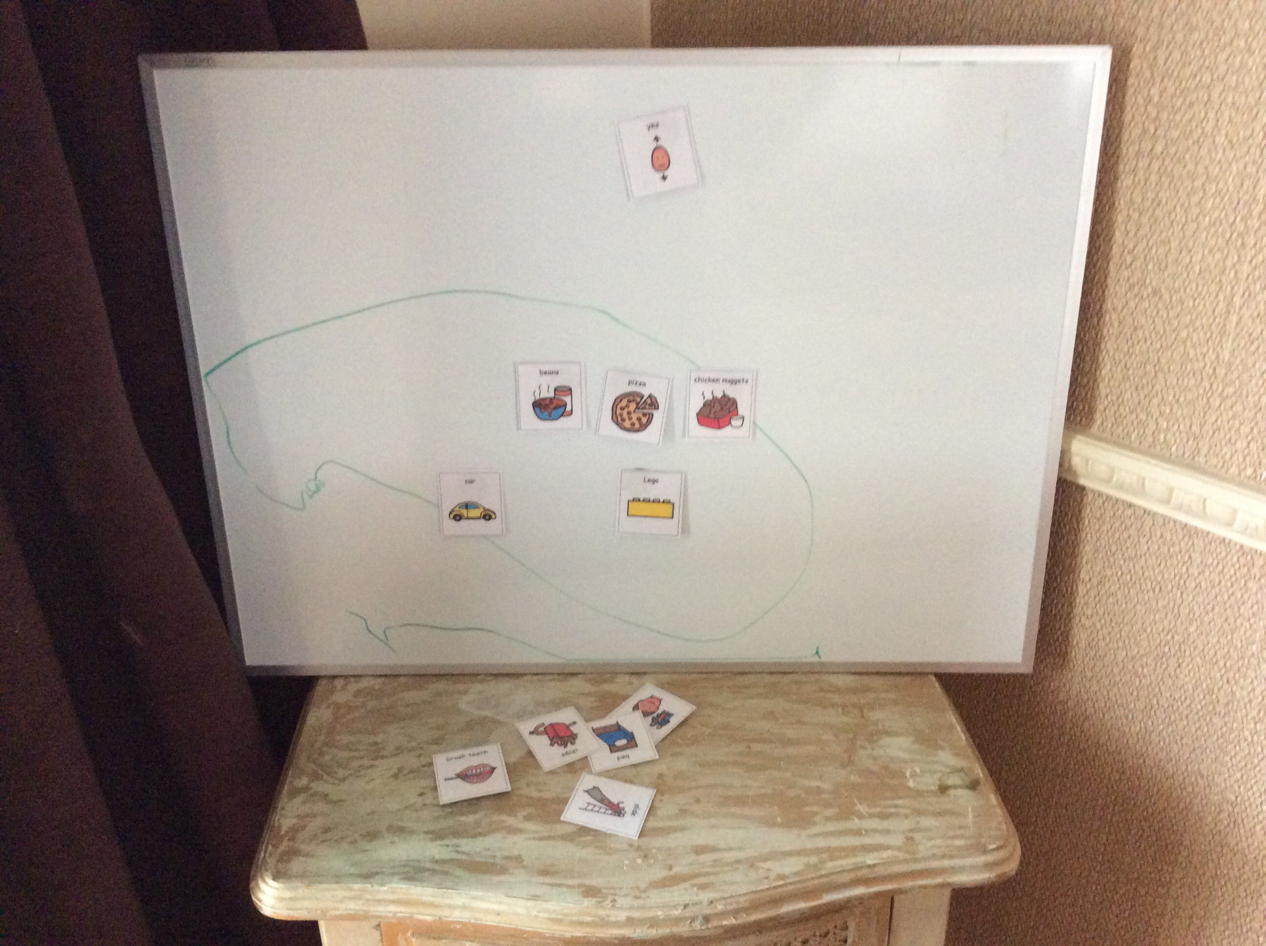 PECS (picture exchange communication system) is what we are trying to use at the moment. I bought hundreds of pictures ready laminated from eBay. I attached magnets to the back of the pictures that I thought Reilly would use the most and attached them to a magnetic board. Makes me sound like a blue peter presenter doesn’t it? Far from it, the pictures stay on the board for approximately 1 hour on a good day. Reilly likes to take them all off and scatter them about the house.
